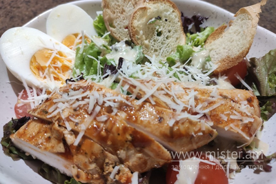 Мідії, креветка коктейльна, сир Моцарелла, помідори Чері, яйце перепелине, мікс салату, цибуля синя, соус бальзамік.