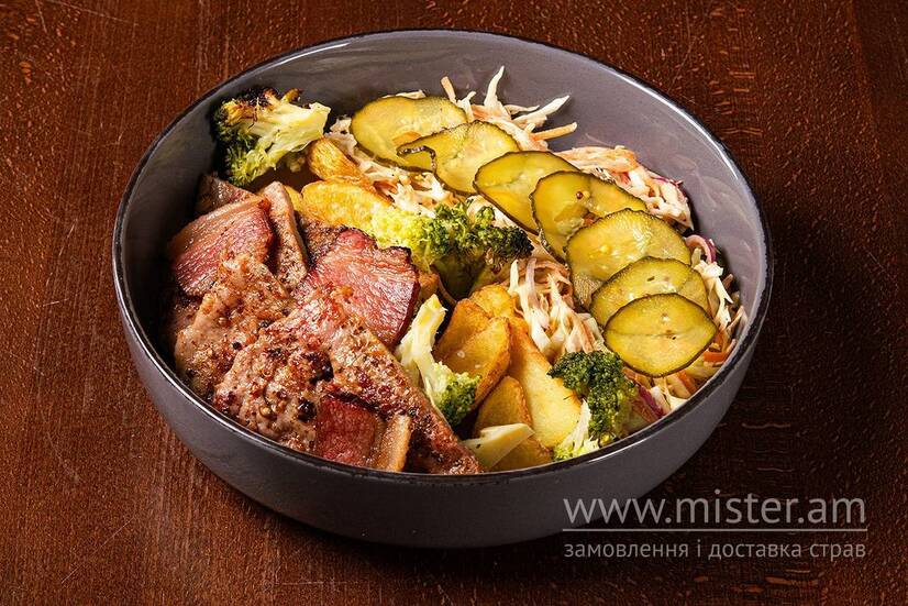 Корейка свина у спеція, картопля у фритюрі, бекон, цибуля синя та пікулі, броколі, гірчиця, зелень, соус фірмовий.