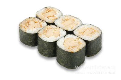 Курка, рис, норі, соєвий соус, імбир, васабі, кунжут, масаго.