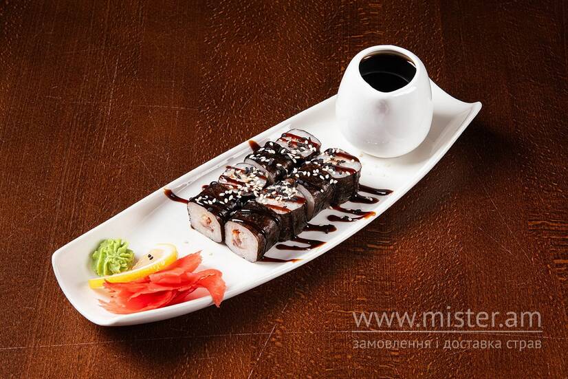 Вугор, рис, норі, огірок, кунжут, соєвий соус, імбир, васабі.