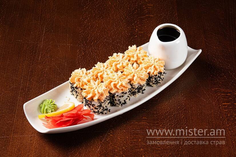 Рис, норі, лосось, кунжут, японський майонез, ікра масаго, авокадо, огірок, крабові палички, соєвий соус, імбир, васабі.