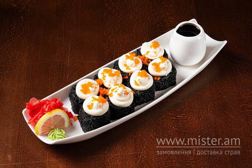 Креветки тигрові у темпурі, сир Філадельфія, авокадо, огірок, чорнила каракатиці, ікра масаго, норі, рис, соєвий соус, васабі, імбир.