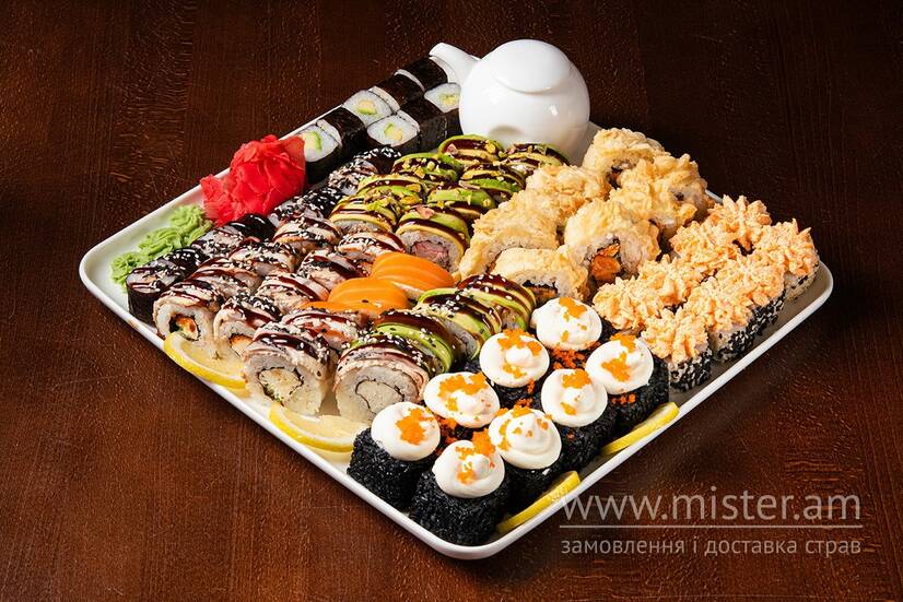 Чорний з креветкою, Теплий з лососем, Макі вугор, Веселка, Каліфорнія лосось, Макі авокадо, Фелікс, Зелений дракон.
