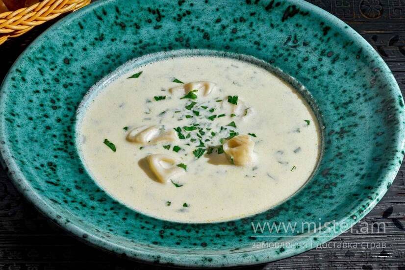 Вершково сирний суп з бринзою та кропом, нотками білого сухого вина та п'ятьма міні хінкалями.