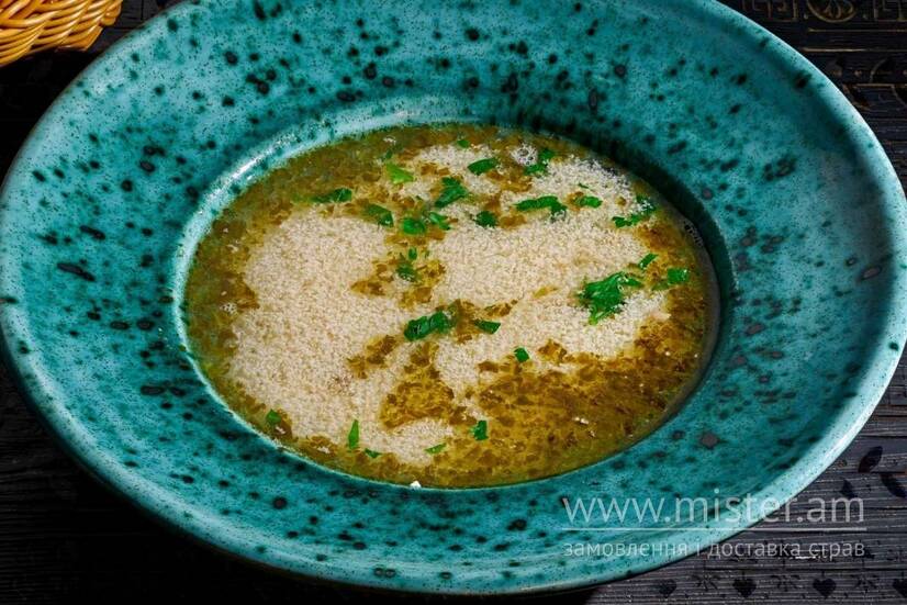 Наваристий суп із курячою гомілкою та зеленню кінзи та петрушки, загущений курячим яйцем.