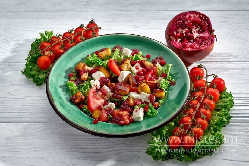Салат з сиром фета, смаженими баклажанами, гранатом, помідорами та листям салату, заправляється соусом наршараб.