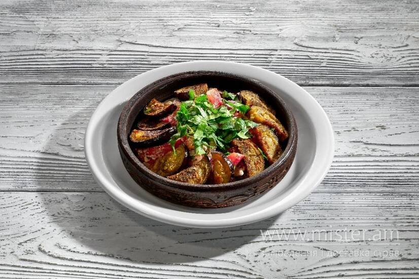 Салат зі смаженими баклажанами і горіхами та свіжими помідорами, синьою цибулею і кінзою заправлений соусом надугі (на основі кисломолочного сиру, з м'ятою і часником).