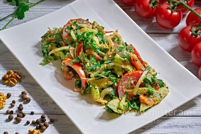 Традиційний грузинський салат з помідорів, огірків та цибулі, заправлений горіховою пастою та виноградним оцтом.