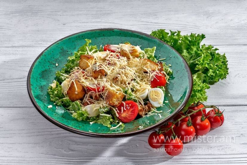 Салат зі смаженої курки, помідорів, яйця, листя салату, заправлений соусом на основі йогурту та гірчиці.
