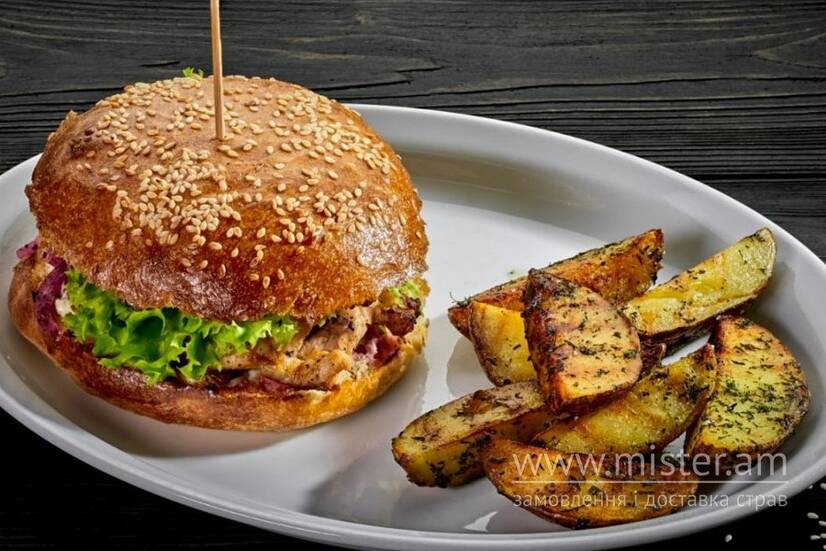 Запашна булочка, куряче стегно, сир сулугуні, листя салату, солений огірок, соус білий. Подається з картоплею.