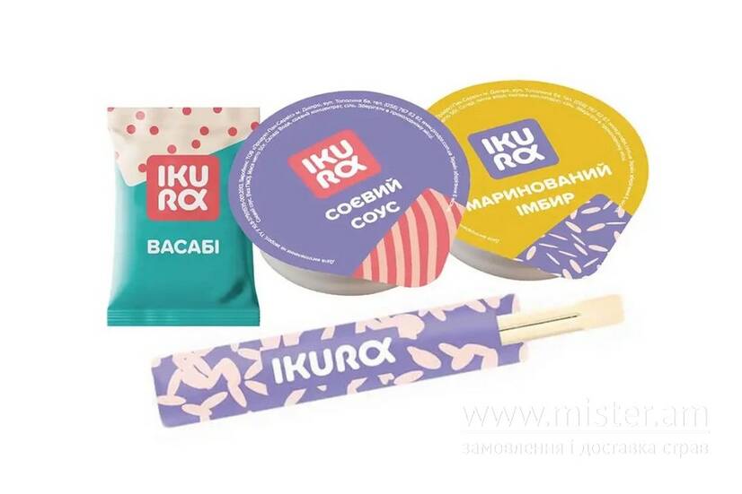 Соєвий соус, васабі, маринований імбир, палички 1 пара.