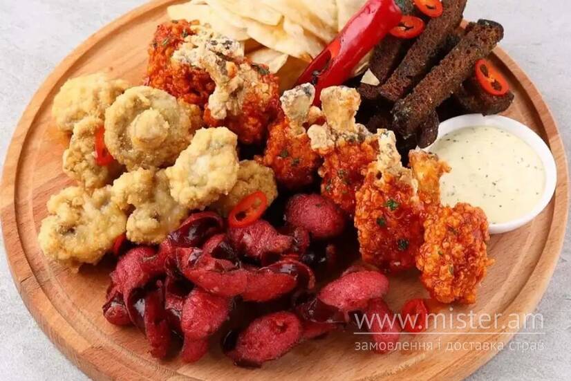 Гострі крильця кімчі, печериці в паніровці, мисливські ковбаски фрі, часникові грінки, лаваш фрі, соус часниковий.