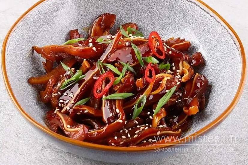 Копчені свинячі вушка, теріяки соус, зелена цибуля, кунжут.