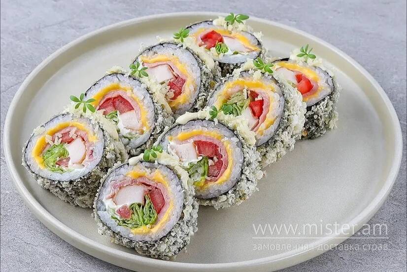 Копчена куряча грудка, бекон, салат айсберг, сир чедер, помідор, крем сир, соус цезар, пармезан.