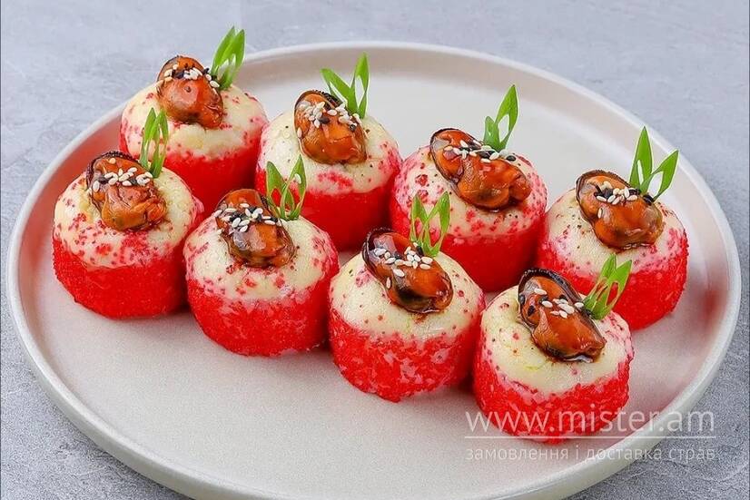 Мідія в соусі теріякі, масаго червона, сніжний краб, крем-сир, огірок, сирна шапочка, кунжут, цибуля зелена.