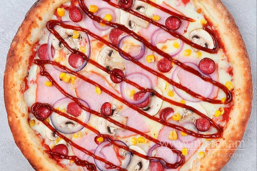 Шинка, печериці, мисливські ковбаски, кукурудза, цибуля маринована, соус барбекю.