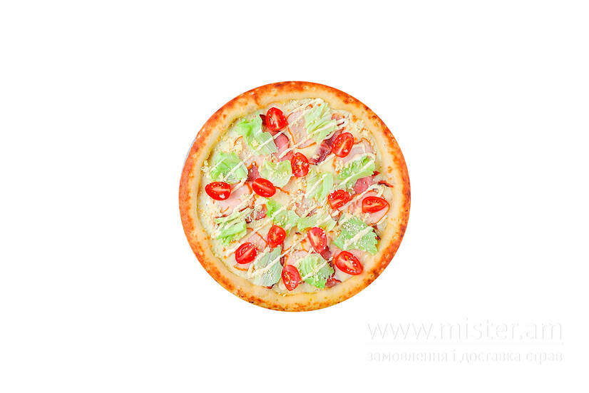 Бекон, копчена куряча грудка, айсберг, помідор, пармезан, моцарела, соус цезар.