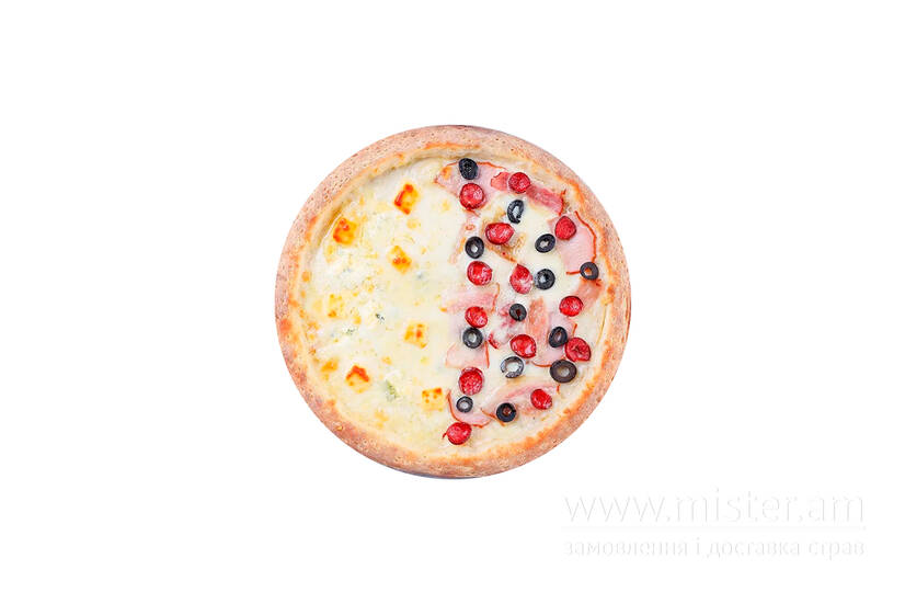 Пармезан, дорблю, гауда, шинка, мисливські ковбаски, бекон, маслини, моцарела, вершковий соус.