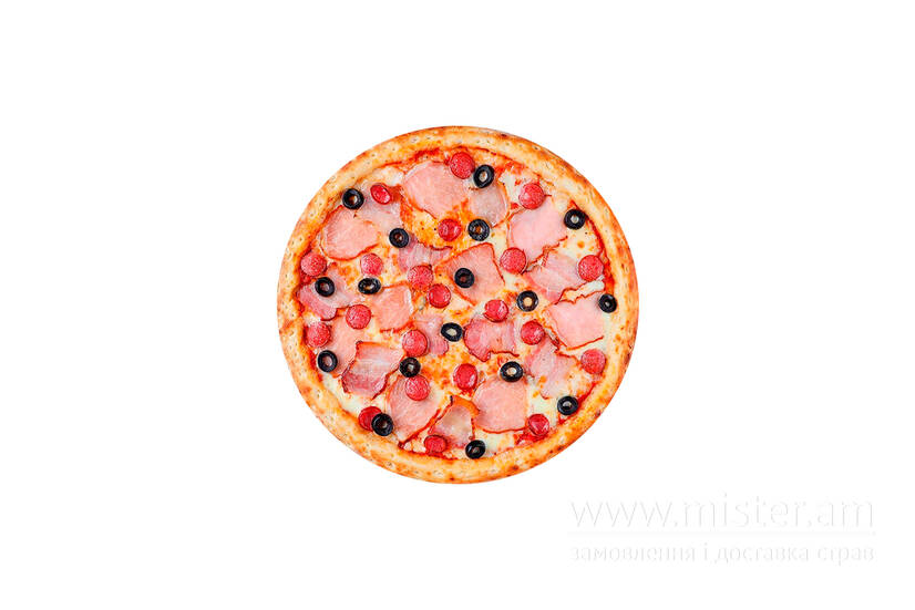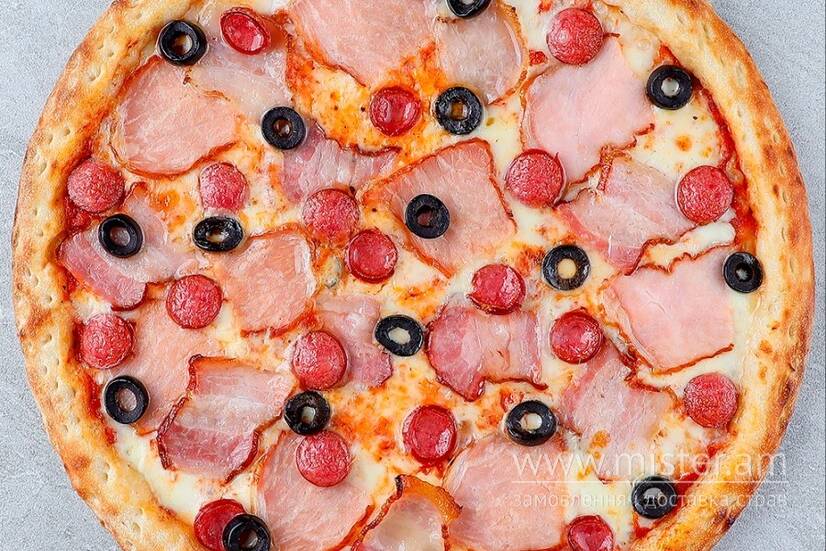 Шинка, мисливські ковбаски, бекон, маслини, петрушка, моцарела.