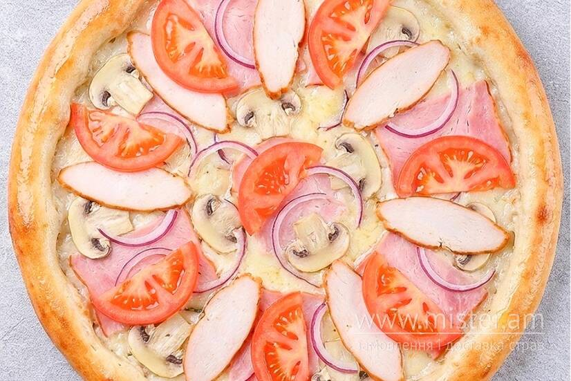 Шинка, печериці, копчена куряча грудка, помідор, цибуля синя, моцарела, вершковий соус.