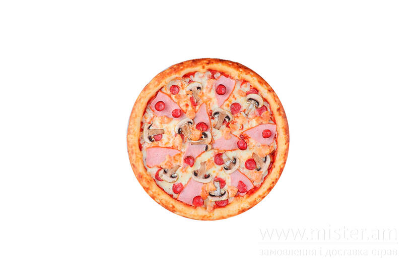 Мисливські ковбаски, шинка, куряче філе, печериці, моцарела, петрушка, орегано.