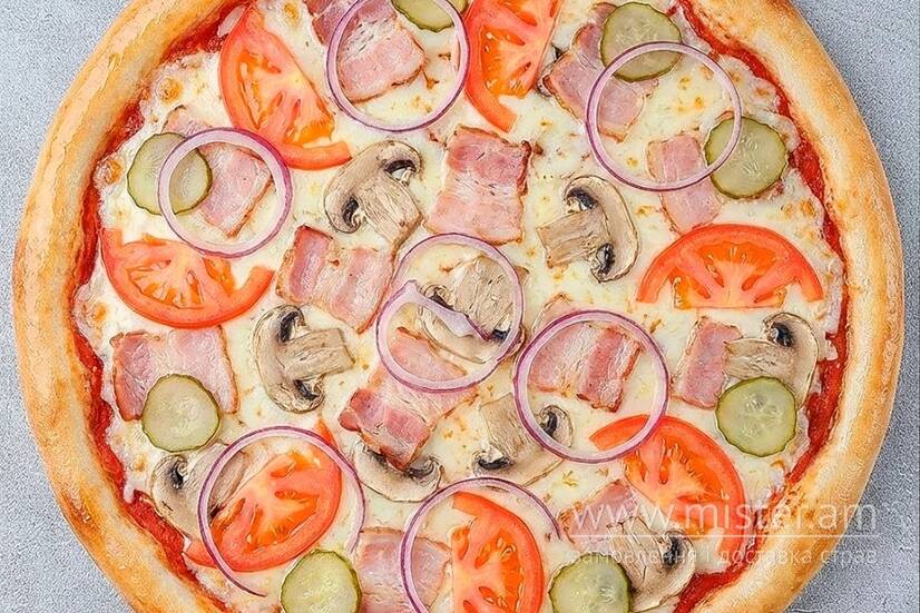 Бекон, печериці, цибуля кримська, помідор, корнішон, моцарела.
