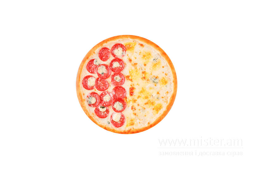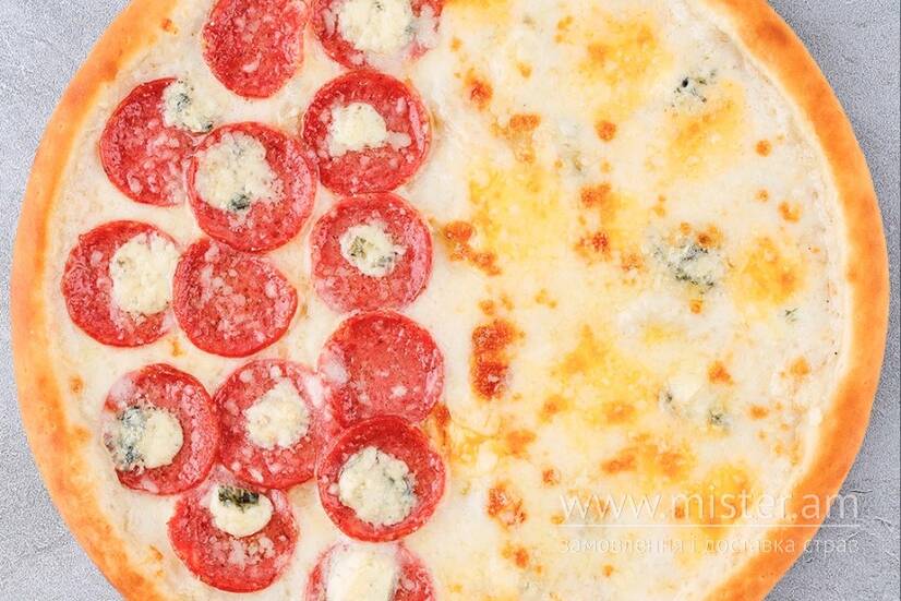 Пепероні, моцарелла, дор блю, сир гауда, пармезан, соус бешамель.