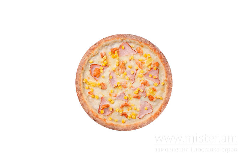 Шинка, куряче філе, ананас, кукурудза, моцарелла, вершковий соус.