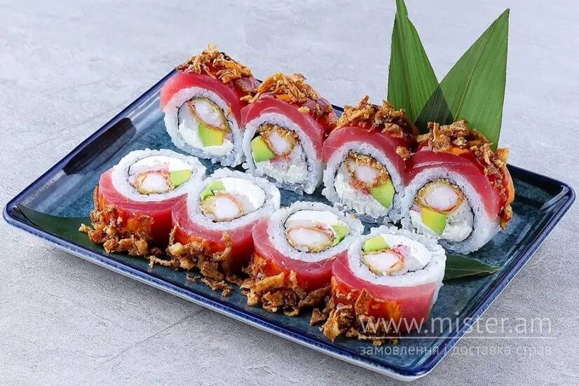 Тунець, креветка панко, сніжний краб, авокадо, крем-сир, унагі та спайсі соус, цибуля кріспі.