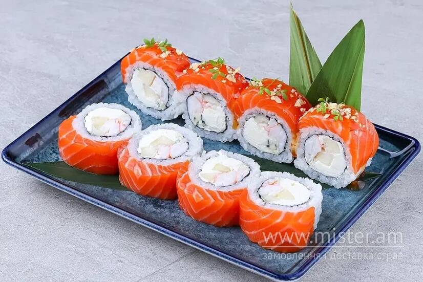 Лосось, креветка, сир дорблю, крем-сир, груша, соус солодкий чилі, мигдалеві пластівці.