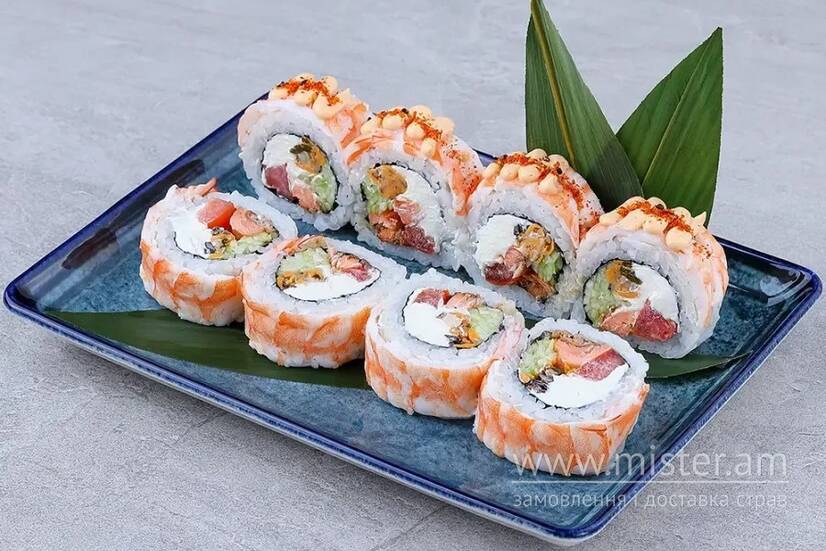 Тигрова креветка, лосось теріяки, мідія, крем-сир, помідор, огірок, соус том ям, спеція тогараші.