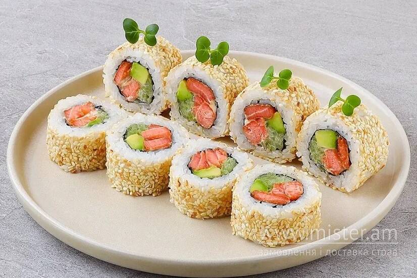 Смажений лосось, соус теріякі, японський майонез, огірок, авокадо, кунжут білий.