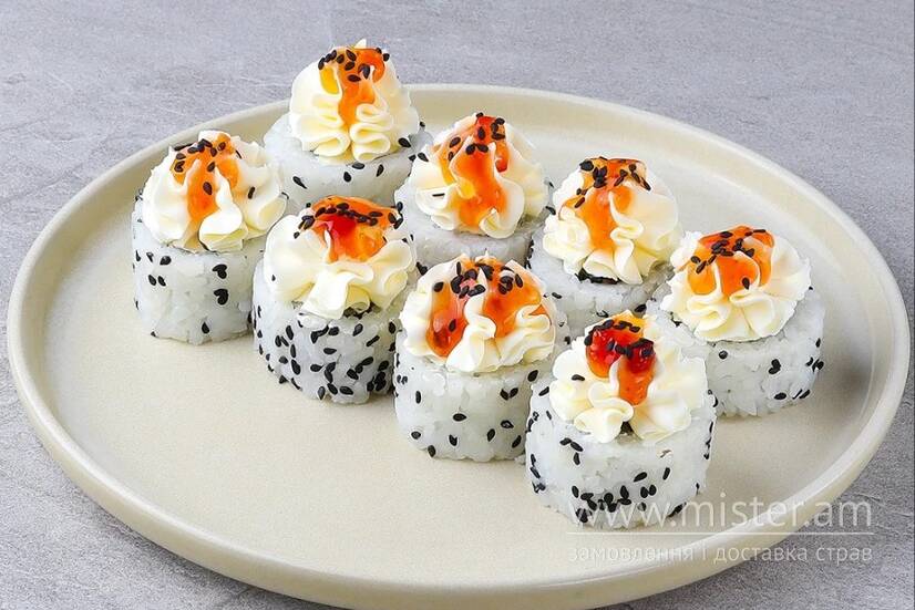 Креветка, крем сир, огірок, соус свит чилі, кунжут чорний.