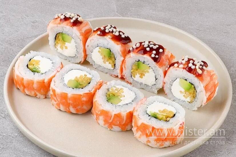 Креветка тигрова, крем сир, манго, авокадо, унагі соус, рисові кульки.