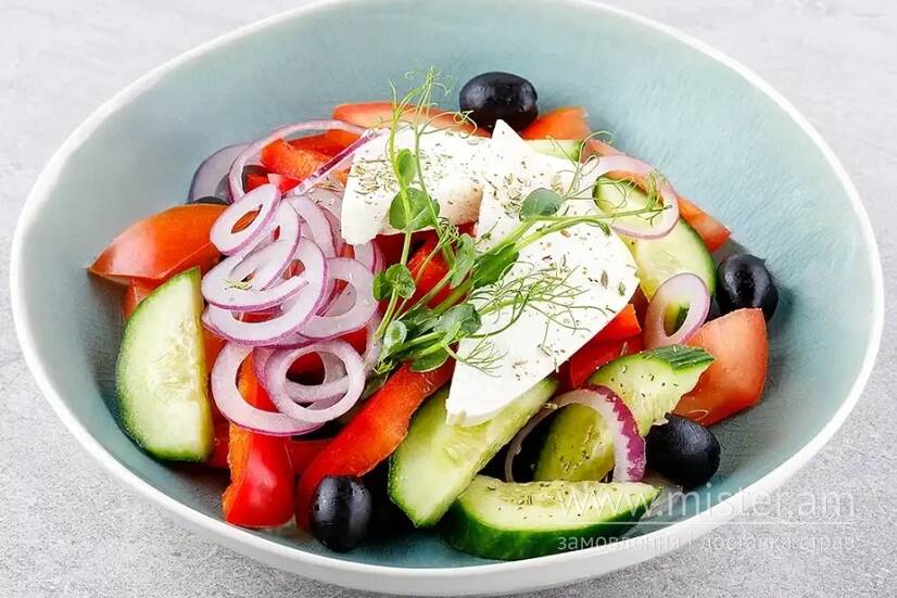 Помідор, огірок, болгарський перець, сир фета, цибуля синя, маслини, оливкова олія, орегано.