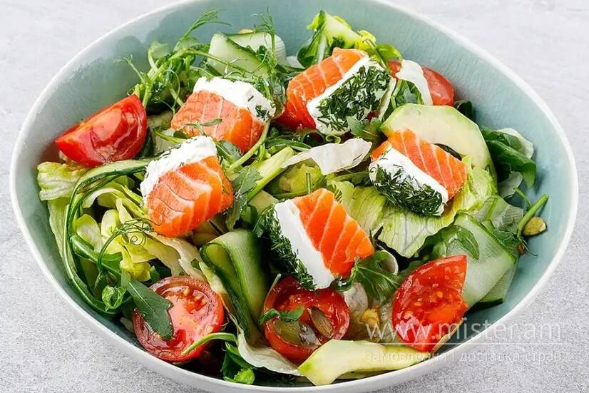 Лосось, вершковий сир, огірок, авокадо, рукола, помідор чері, салат айсберг, гарбузове насіння, медово-гірчічна заправка.