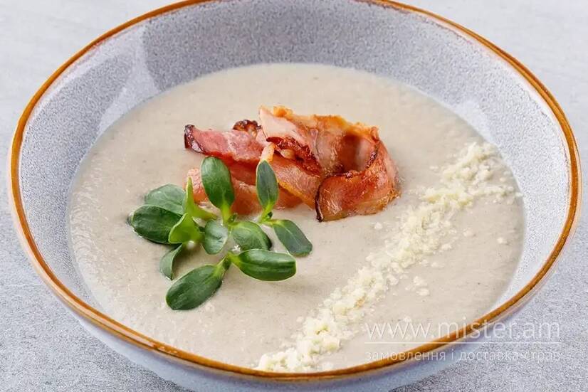 Печериці, пармезан, вершки, бекон, фенугрек, цибуля, часник, картопля, зелень.