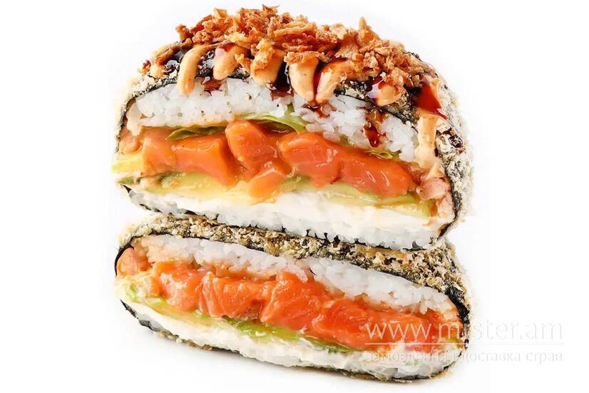 Лосось кімчі, крем-сир, авокадо, салат айсберг, рис, норі, панко сухарі, унагі соус, соус спайс, цибуля криспі.