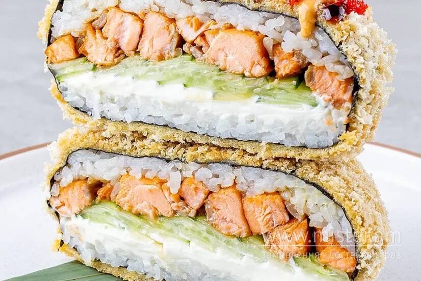 Лосось теріяки, крем-сир, огірок, рис, норі, панко сухарі, унагі соус, соус спайс, ікра масаго.