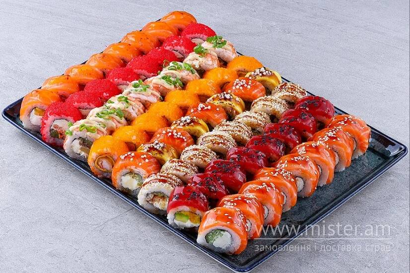 Рол Філадельфія Унагі, рол Філадельфія з тунцем, рол Сяке чіз, Ебі темпура, рол Унагі чіз, рол Truffle shrimp, рол Кунсей, рол Філа Mango.