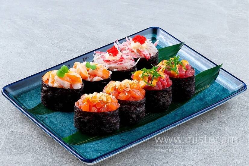 Спайс суші з лососем (2 шт), спайс суші з креветкою (2 шт), спайс суші з тунцем (2 шт), суші з крабом (2 шт).