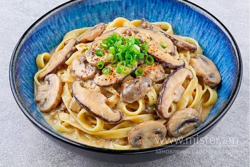 Печериці, шиїтаке, місо паста, вершки, спеція тогараші, цибуля зелена, паста тальятелле.