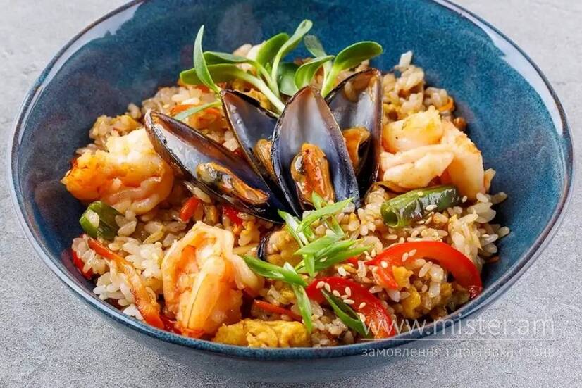 Креветка тигрова, мідія, болгарський перець, цибуля синя, морква, спаржева квасоля, яйце куряче, кунжутна олія, рис паровий, імбир, часник, соєвий соус, цибуля зелена, кунжут.