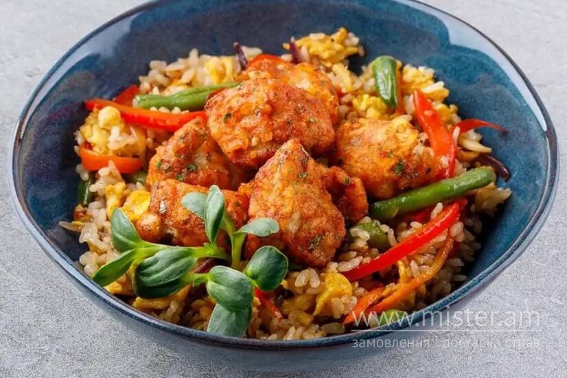 Свинина кімчі, болгарський перець, цибуля синя, морква, спаржева квасоля, яйце куряче, кунжутне масло, рис паровий, імбир, часник, соєвий соус, цибуля зелена, кунжут.