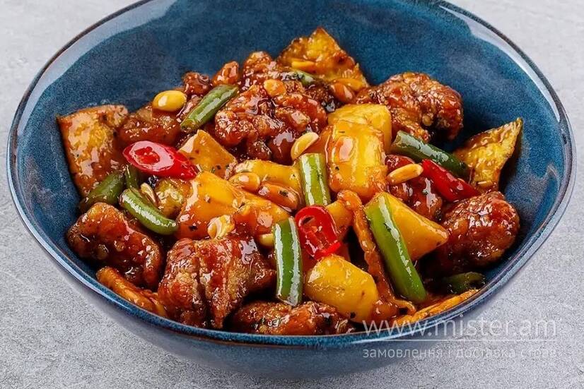 Куряче філе стегна, ананас, арахіс, спаржева квасоля, омлет, перець чилі, соус теріякі.