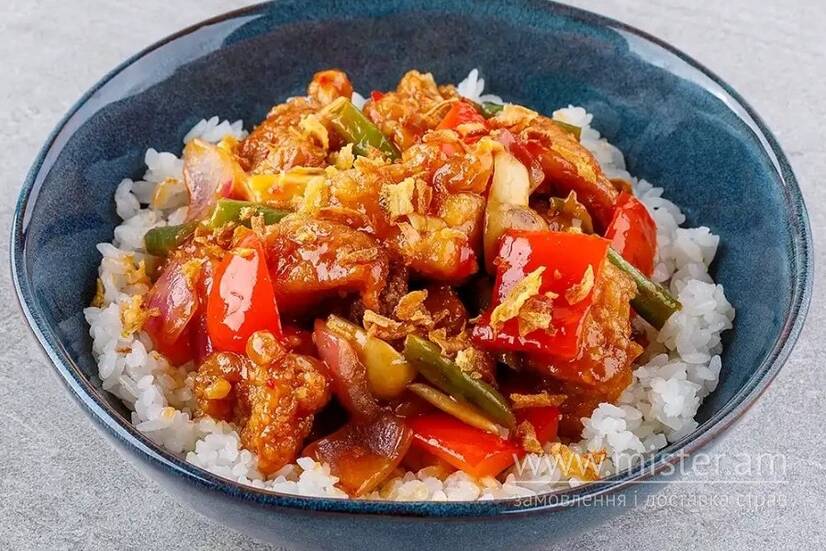 Філе курячого стегна, болгарський перець, спаржева квасоля, цибуля синя, печериці, рис паровий, соус кисло-солодкий, цибуля криспі, імбир, часник.