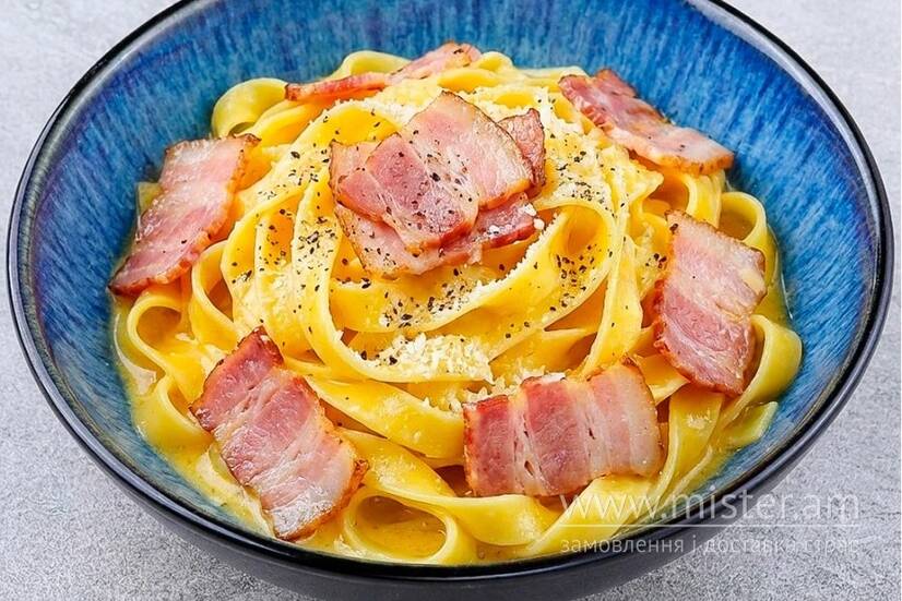 Бекон, яєчні жовтки, пармезан, перець свіжемелений, паста тальятелле.