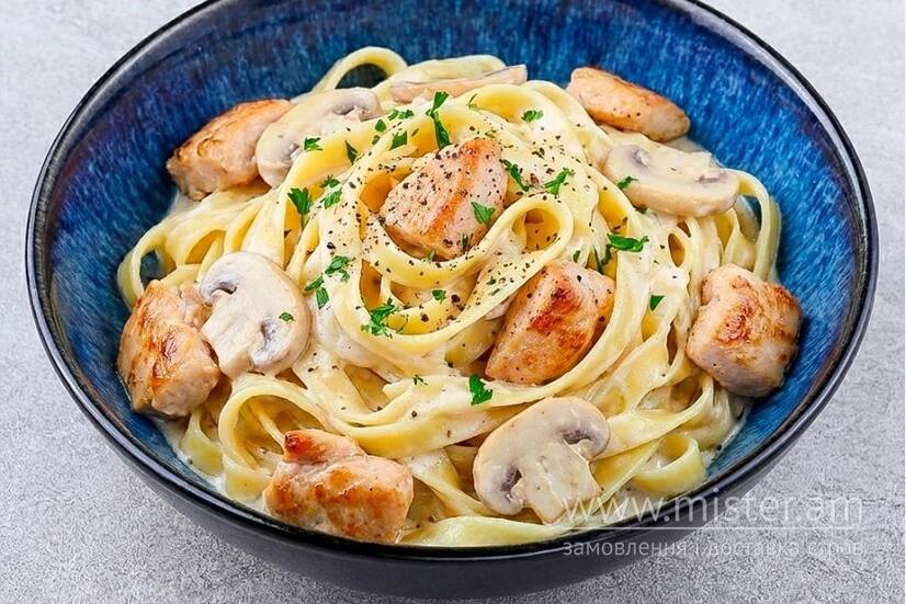 Куряче філе, печериці, вершки, перець свіжемелений, петрушка, паста тальятелле.