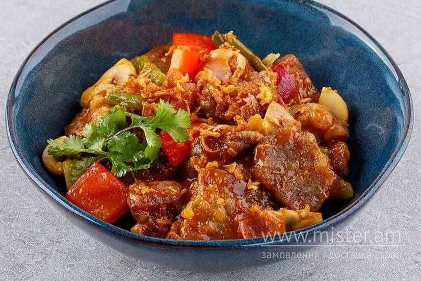 Свинина, перець болгарський, цибуля синя, спаржева квасоля, печериці, імбир, часник, соус кисло-солодкий, кімчі, цибуля криспі, зелень.