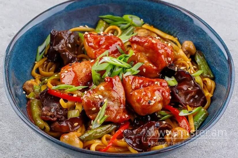 Філе курячого стегна, печериця, болгарський перець, деревний гриб, спаржева квасоля, цибуля порей, локшина удон, соус теріяки, цибуля зелена, кунжут.